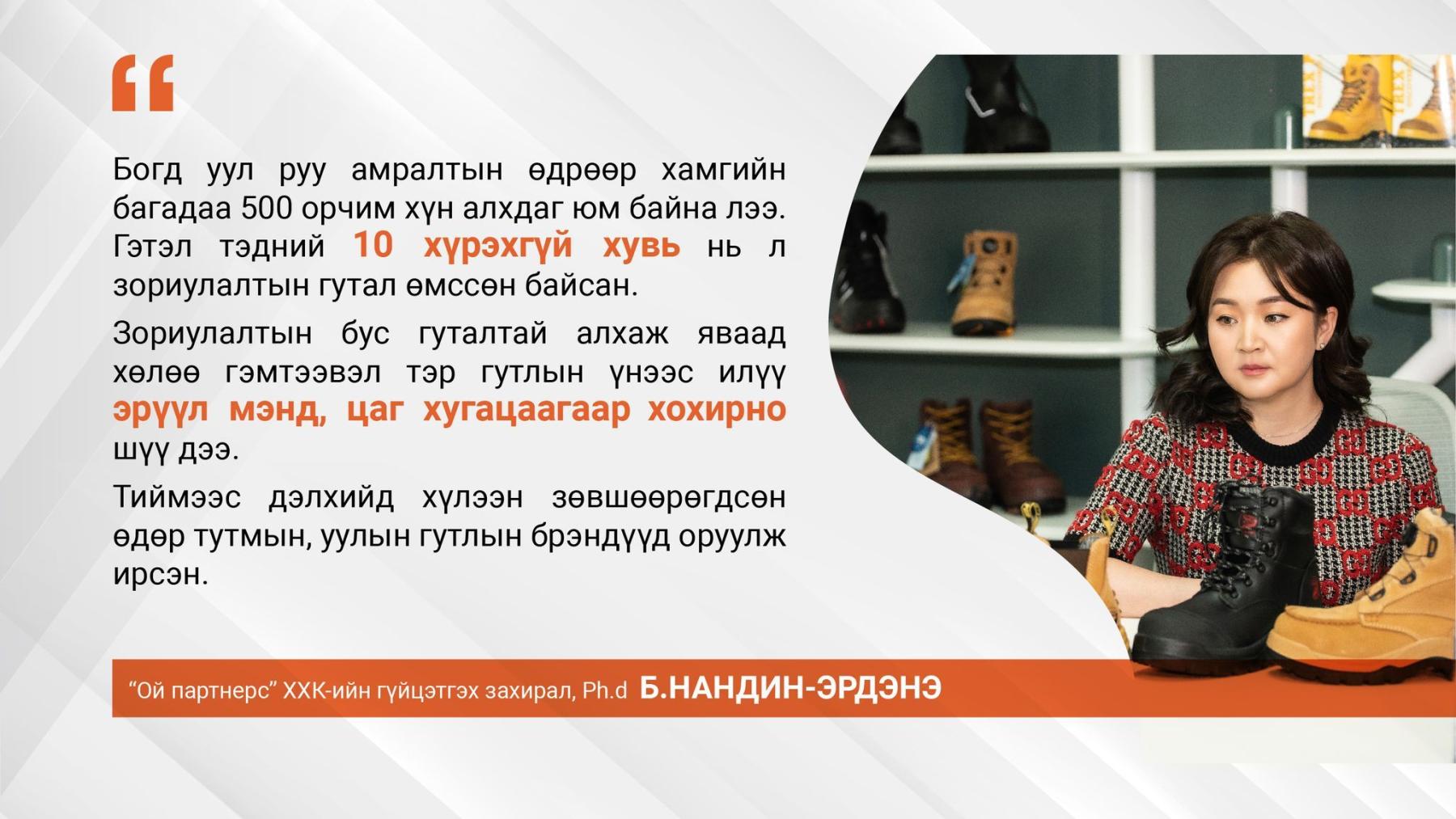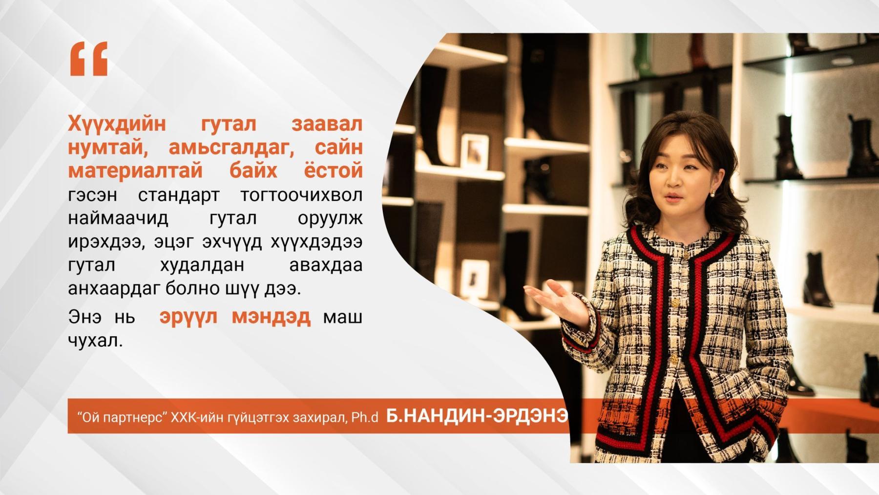Монгол Ардын Намын дэргэдэх Социал демократ Монголын эмэгтэйчүүдийн холбооны Удирдах зөвлөлийн гишүүн, улс төр судлалын доктор Б.Нандин-Эрдэнэтэй ярилцлаа. “Ой партнерс” компанийн гүйцэтгэх захирал тэрбээр монгол хүний хөлний онцлогт тохирсон гутлуудыг үйлдвэрлэж, чанарыг хямд үнэтэй хослуулан дотоодын зах зээлд нийлүүлж яваа үндэсний брэнд бүтээгчдийн нэг юм.