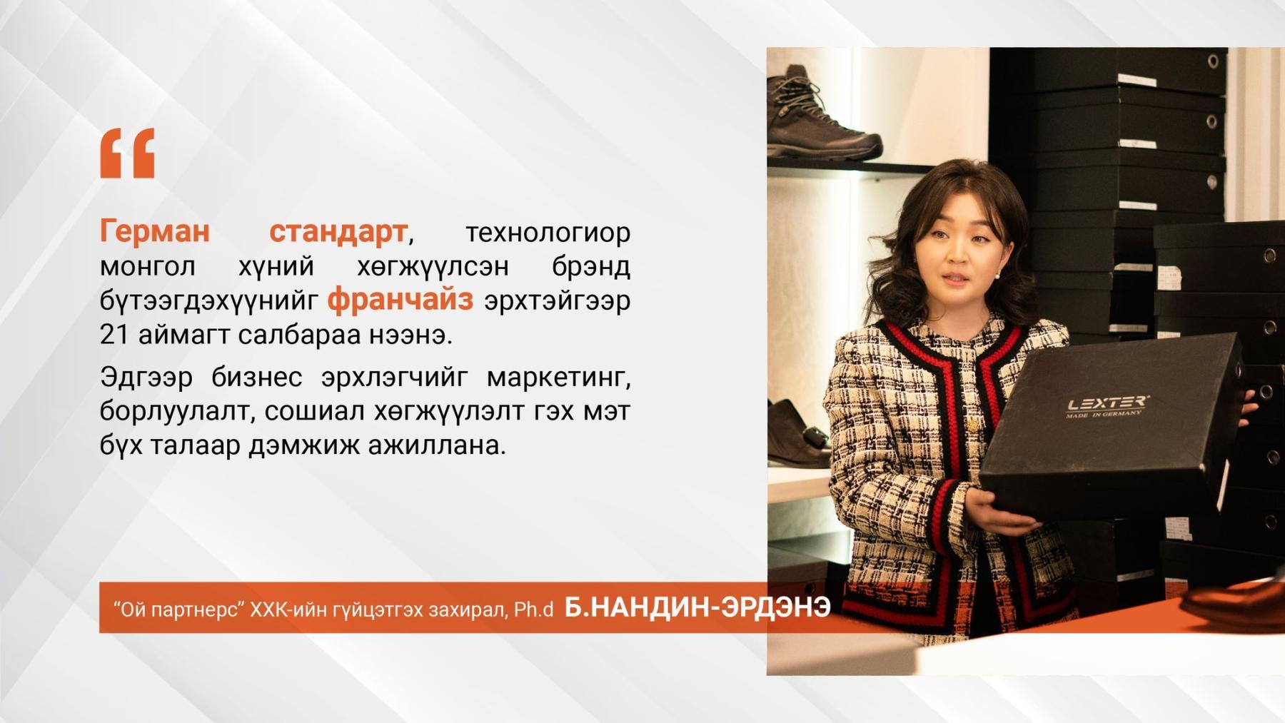 LEXTER брэнд нь Герман технологиор монголчуудын хөлийн онцлогт тохирсон, чанартай, загварлаг эрэгтэй, эмэгтэй арьсан өдөр тутмын бүх төрлийн гутлыг худалдаалдаг. Бид бүтээгдэхүүний материалаа сонгохдоо хүний биед эвтэйхэн, тав тухтай, аюулгүй байхад анхаардаг. Бид LEXTER брэндийн нэрийн дэлгүүрийг Улаанбаатар (5) болон 21 аймагт (тус бүр 1) франчайз эрхээр нээхээр төлөвлөн ажиллаж байна. Эхний франчайз дэлгүүрүүд нээгдээд амжилттай явж байна.